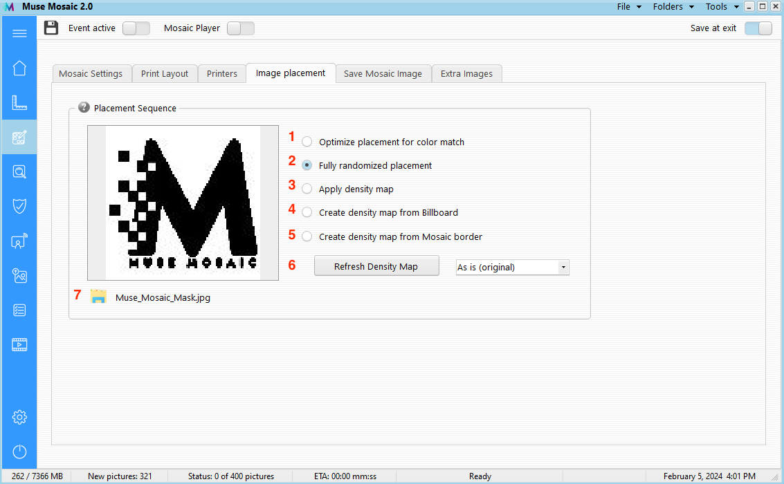 The Image Placement tab under the Event Admin tab in Muse Mosaic provides options for how and where the images will be placed in the mosaic when received into the watched folder.