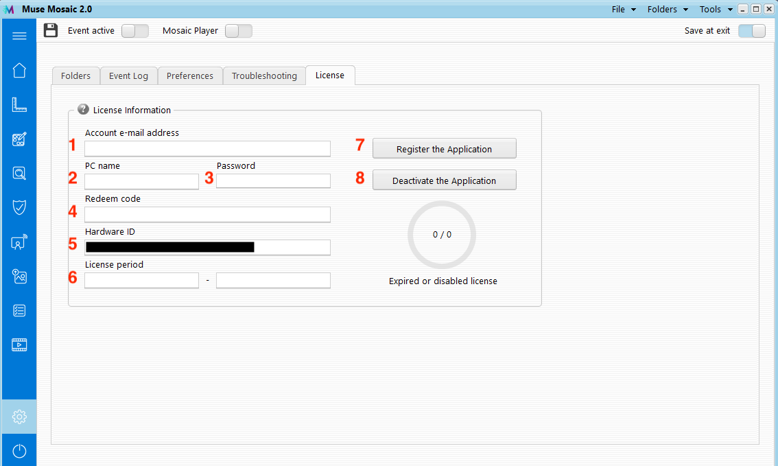 5. Hardware ID—This information is automatically generated and can not be altered. It identifies the computer running Muse Mosaic and will be represented as an ID Number.