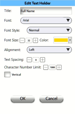 - This is an easy way for guests to enter in text that you prompt them for. This can be their Name, Sports position/Player# (for trading cards) or any other short information you want to appear on the end result. Font, color and formating can all be customized:
